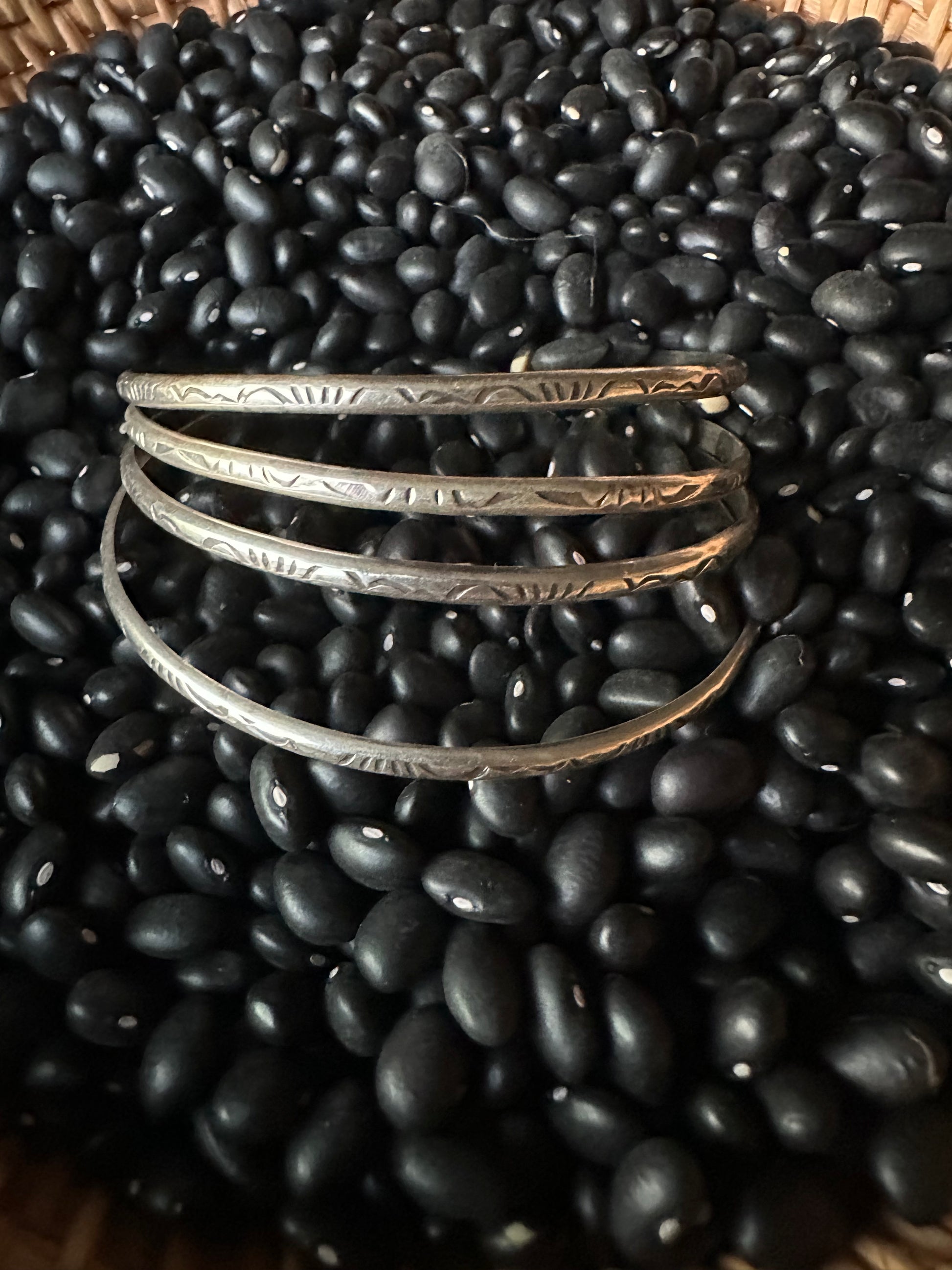 6.5 inches in diameter, silver stacker bracelets with beautiful Native patterns!