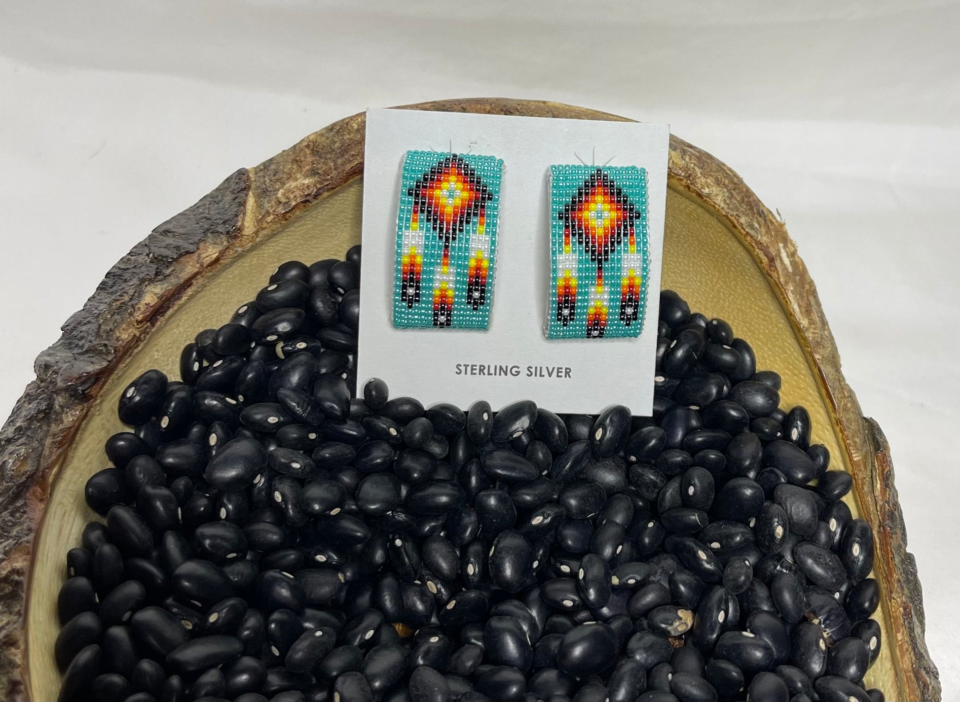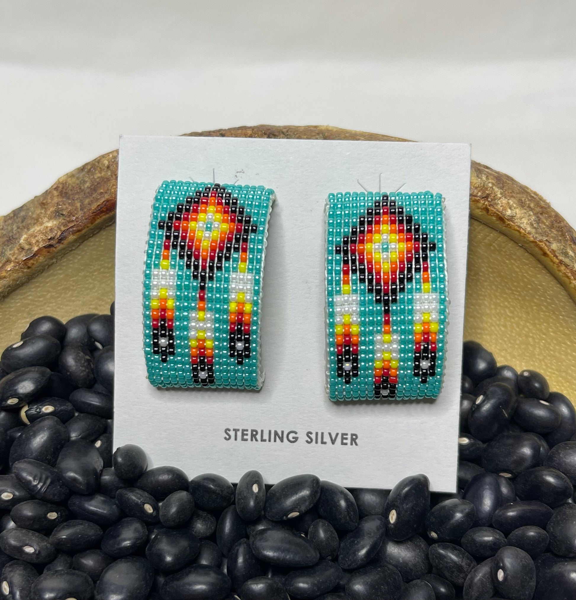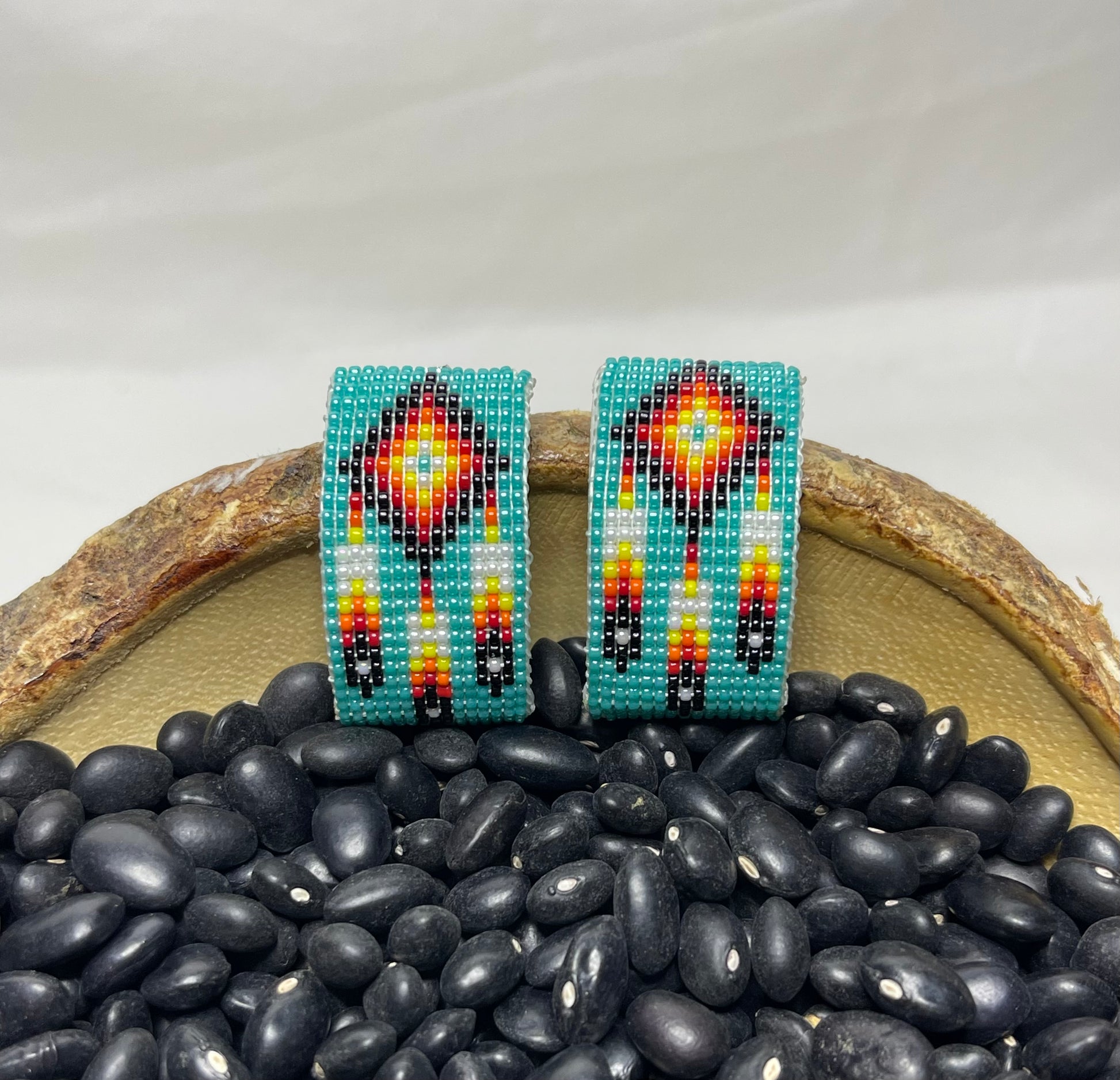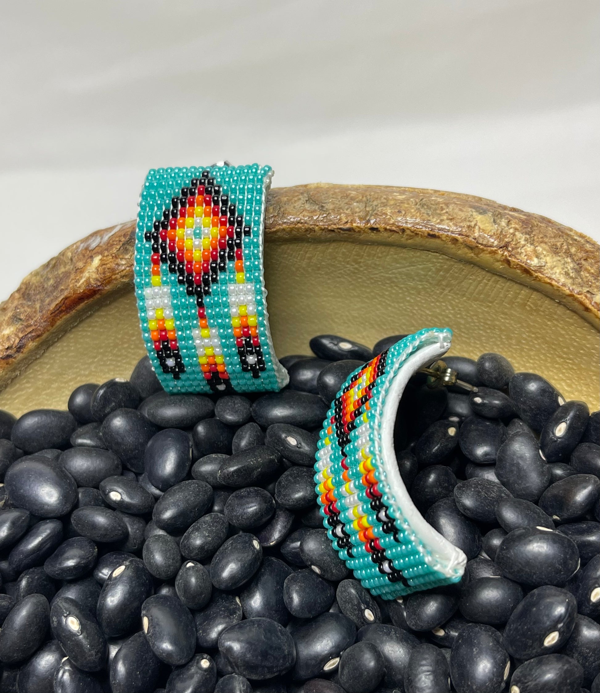 1.5 inches in length, gorgeous half hoop earrings with a beautiful Native American symbol in the middle of vibrant turquoise blue beads!!