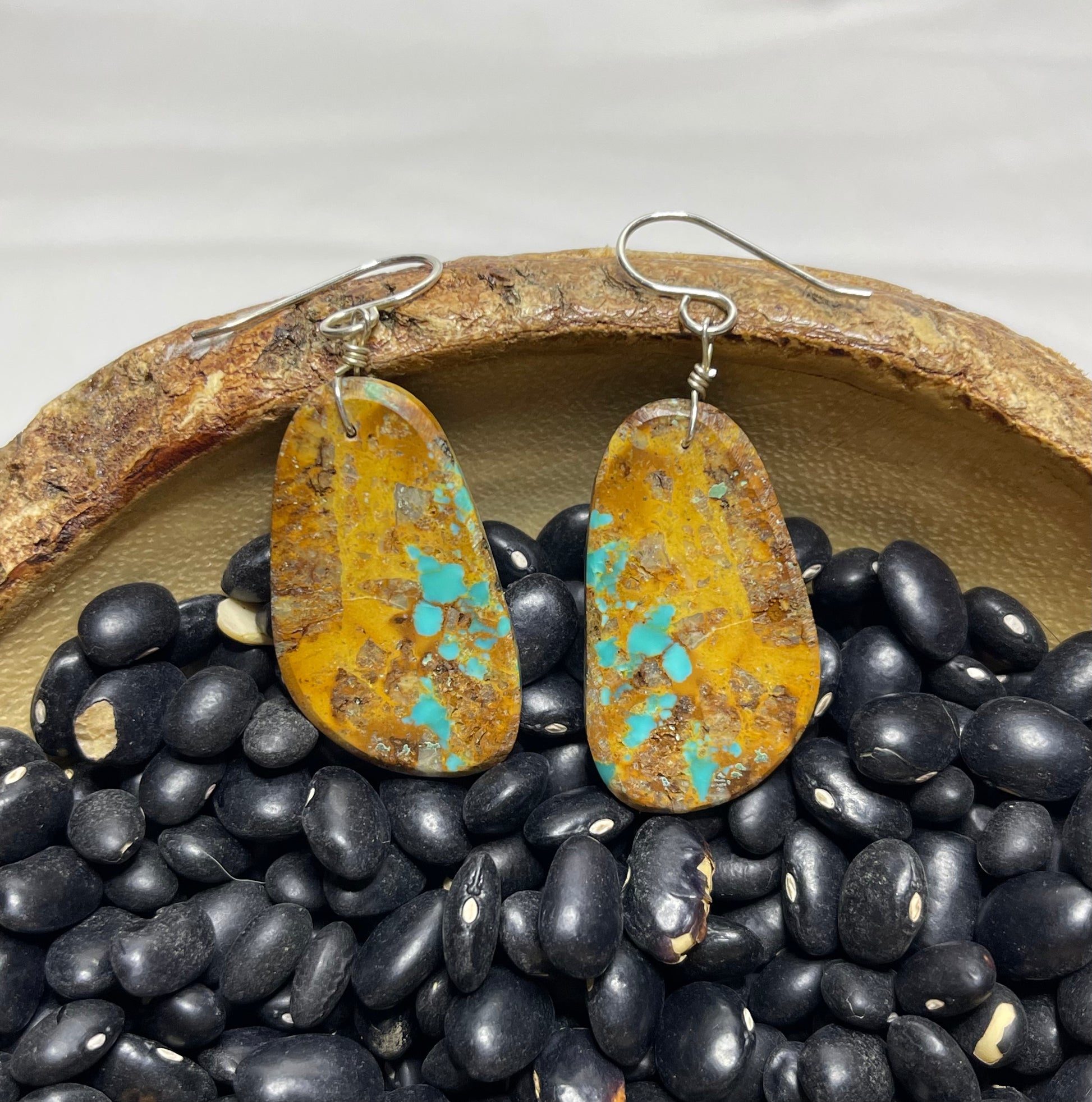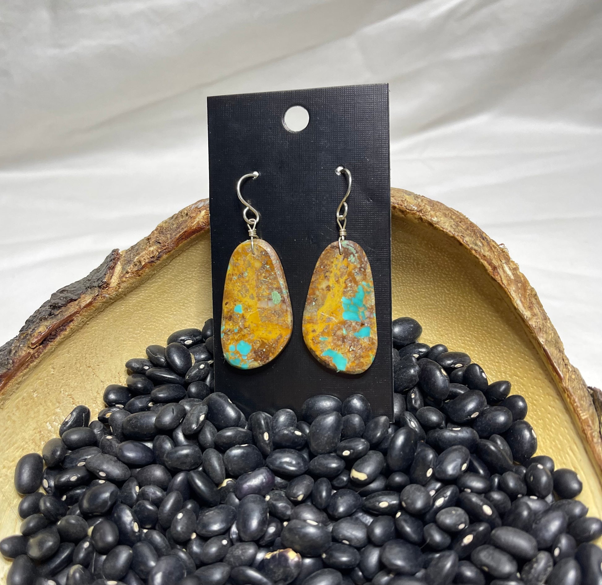 1.4 inches in length, eye catching slab earring with a beautiful green turquoise stone and turquoise matrix!!
