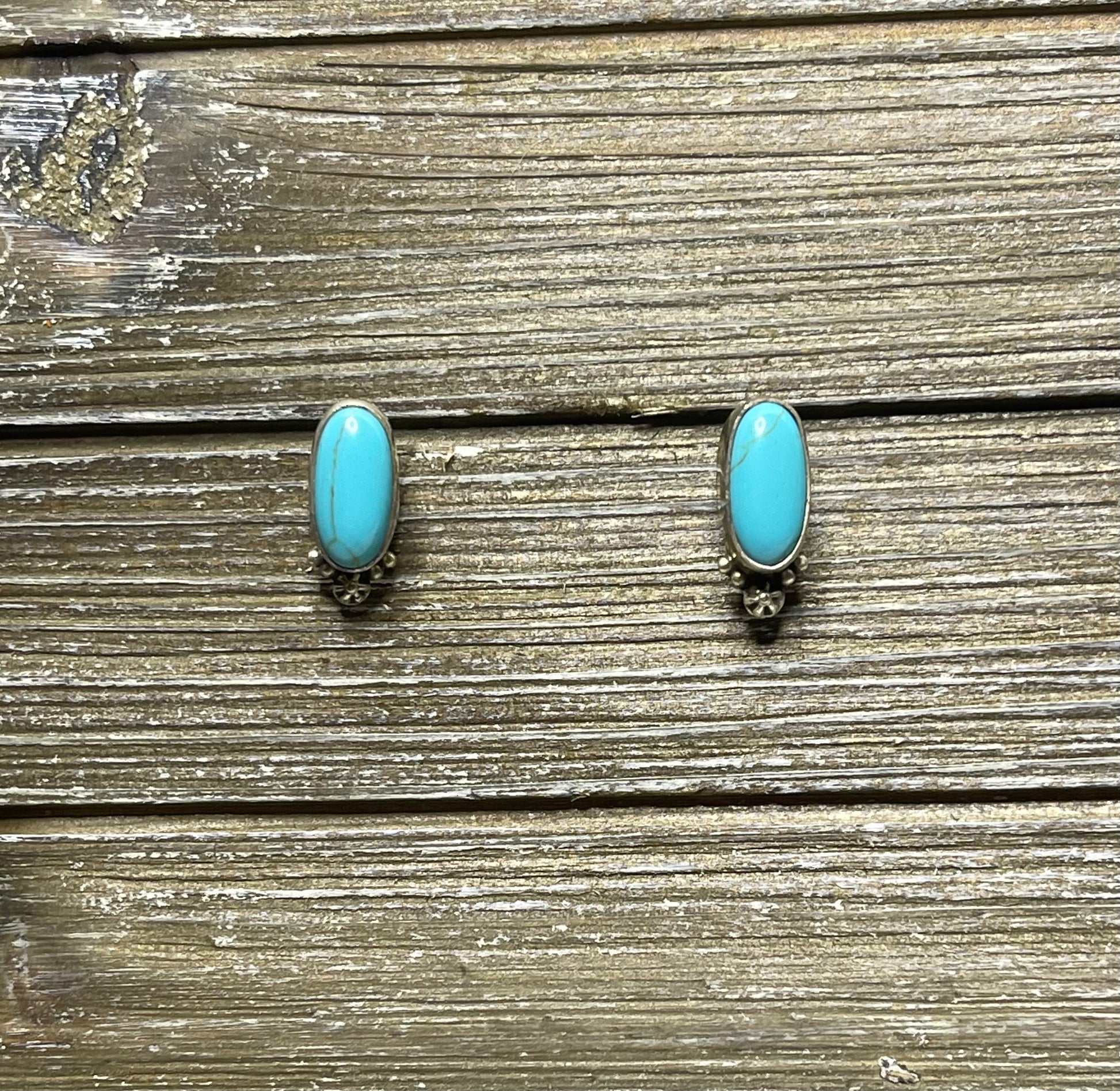 1.6 cm in length, these beautiful sterling silver earrings have gorgeous a turquoise stone, with beautiful embroidery on the bottom of the stone.